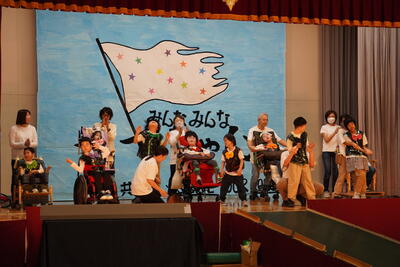 子どもたちみんなステキなアイドルとして登場。家族のみなさんにはペンライトと推しうちわで応援してもらいました。一幕目はアイドルたちが,パズルを作ったり看板をライトアップしたりフロートをふくらませたりしました。出てくる言葉は「みんなみんなイイじゃん」です。二幕目はエアバンドアイドル,「女々しくて」の楽器演奏とダンスで盛り 上げました。三幕目はアクションを見せるアイドル,バスケットのシュートにマット押し,バランスボール,平均台,最後にポーズも決めました。幕ごとの終わりにアイドルたちが花道をおり,一番のファンであるお父さんお母さんに花束をプレゼントしました。最後の四幕目はアイドルの王道「YOUNGMAN」の曲で全員で踊りました。今年度は家族のみなさんも参加していただき大いに盛り上がった演目となりました。