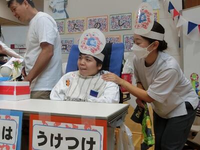 作業学習で製作した巾着袋などの布製品や、畑で栽培したラベンダー製品、収穫・脱穀したあずきを近隣の事業所で加工してもらったあんぱんなどを販売しました。ゲームコーナーでは、大阪万博キャラクターみゃくみゃく倒しゲームにお客さんに挑戦してもらい、畑で収穫した大根とじゃがいもを景品としてプレゼントしました。